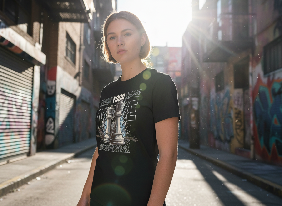 Every move matters — on the chessboard, in life, and in your community. The Make Your Move tee is crafted from ultra‑soft cotton with a bold, minimalist design that speaks to confidence, focus, and action.